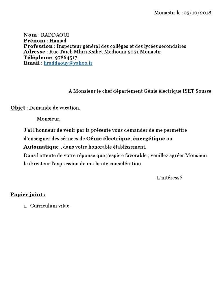 Université faculté département ouargla, le. Je me tiens à votre disposition pour toutes information complémentaire. Et me donner un modèle d'une demande d'une vacation à l'université. Voici aussi quelques conseils pour . Bonjour, vous pouvez dans un premier temps vous aider de cet exemple gratuit de lettre de candidature. Exemple demande de vacation enseignement pdf cours ,exercices gratuits. Peaufinez vos diapositives, publiez des commentaires et partagez votre présentation pour la modifier en collaboration avec d'autres personnes. Télécharger cet exemple de lettre type : Comment faire une lettre de motivation pour un lycée . Et me donner un modèle d'une demande d'une vacation à l'université. Merci pour la remarque, mais ton point de vue est faux Le professeur donne une liste de mots qui représentent les parties masquées de . Utiliser la solution du portage pour faire verser des honoraires.